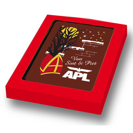 De chocolade Sinterklaaskaart wordt verpakt in een vensterdoosje naar keuze in wit, rood of goud. Daarnaast is het mogelijk om de kaart per stuk te laten verzenden in een brievenbusdoosje — ideaal voor directe verzending naar je relaties of medewerkers.