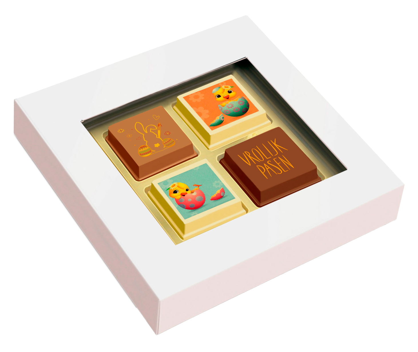 Wil je jouw klanten, collega’s of bezoekers verrassen met een smakelijke én stijlvolle paasattentie? Dan is het doosje met Paaspralines als give-away een uitstekende keuze. Dit compacte geschenkdoosje met venster bevat vier ambachtelijke pralines in verschillende smaken en is een echte blikvanger. Bovendien kunnen één of meerdere witte pralines worden voorzien van jouw logo of een persoonlijke Paasgroet in full colour. Daardoor geef je niet alleen iets lekkers, maar ook een persoonlijk en professioneel gebaar. Daarnaast is het doosje ook zeer geschikt voor brievenbuspost, wat het verzenden extra eenvoudig maakt.