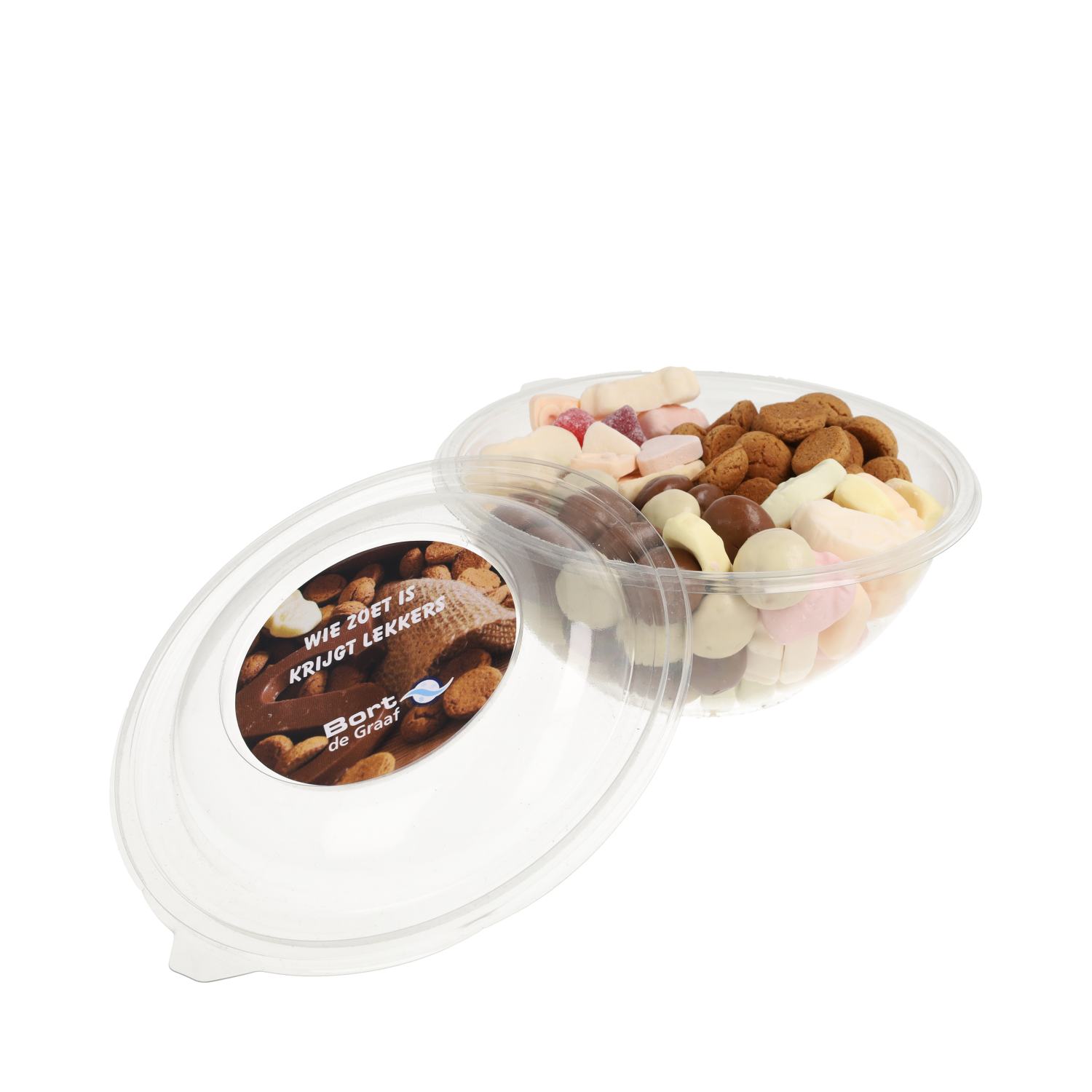 Daarnaast heeft de peuzelbak een transparante deksel met een full colour sticker. Deze sticker ontwerp je volledig naar eigen wens. Plaats er bijvoorbeeld je bedrijfslogo, een persoonlijke boodschap of een vrolijke Sinterklaasafbeelding op. Hierdoor maak je van een lekkernij niet alleen een traktatie, maar ook een uniek relatiegeschenk. Bovendien verhoogt een opvallende sticker de feestelijke uitstraling van het geheel.