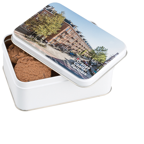 Op zoek naar een smakelijk en stijlvol relatiegeschenk? Kies dan voor een rechthoekig wit koekblik, gevuld met heerlijke Jules Destrooper roomboterwafels of American Cookies. Dit smakelijke geschenk zal je klanten niet alleen verwennen, maar ook een glimlach op hun gezicht toveren bij een kopje koffie of thee. Bovendien kan het koekblik volledig gepersonaliseerd worden, zodat je bedrijfslogo of ontwerp op de deksel wordt gedrukt in full colour.